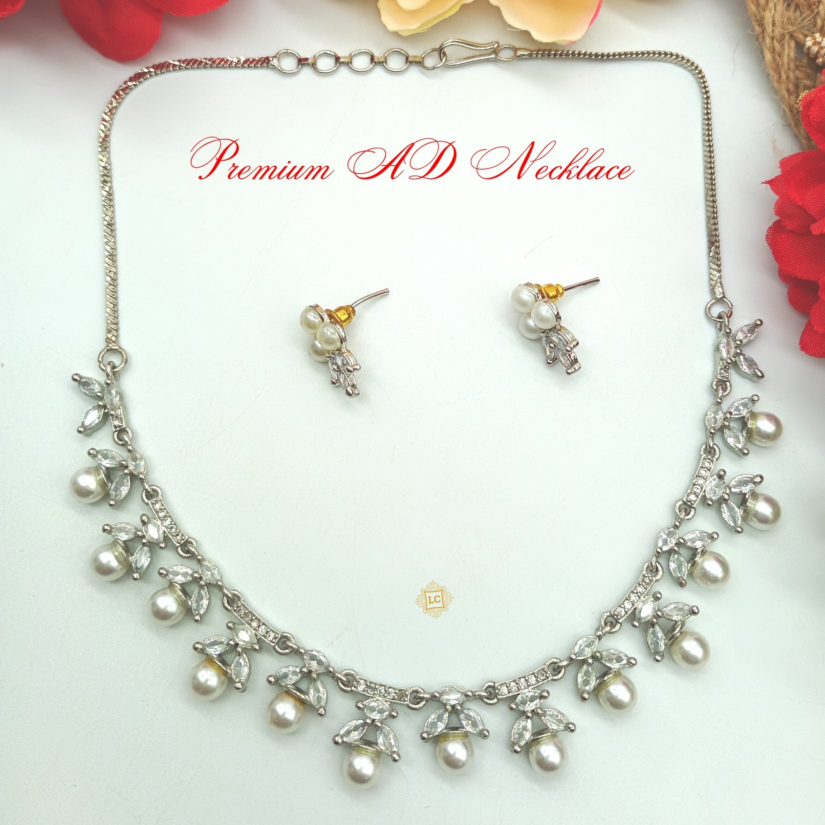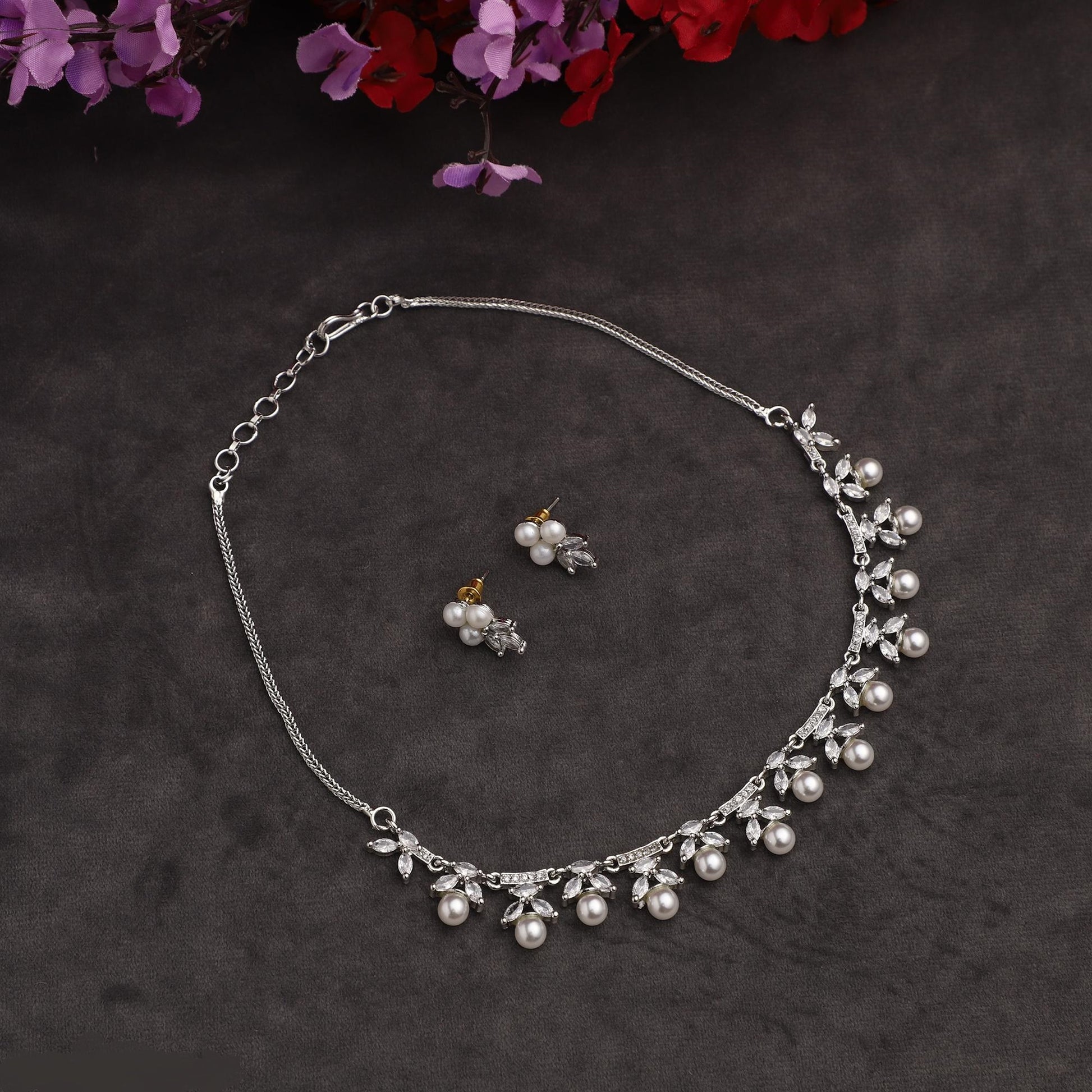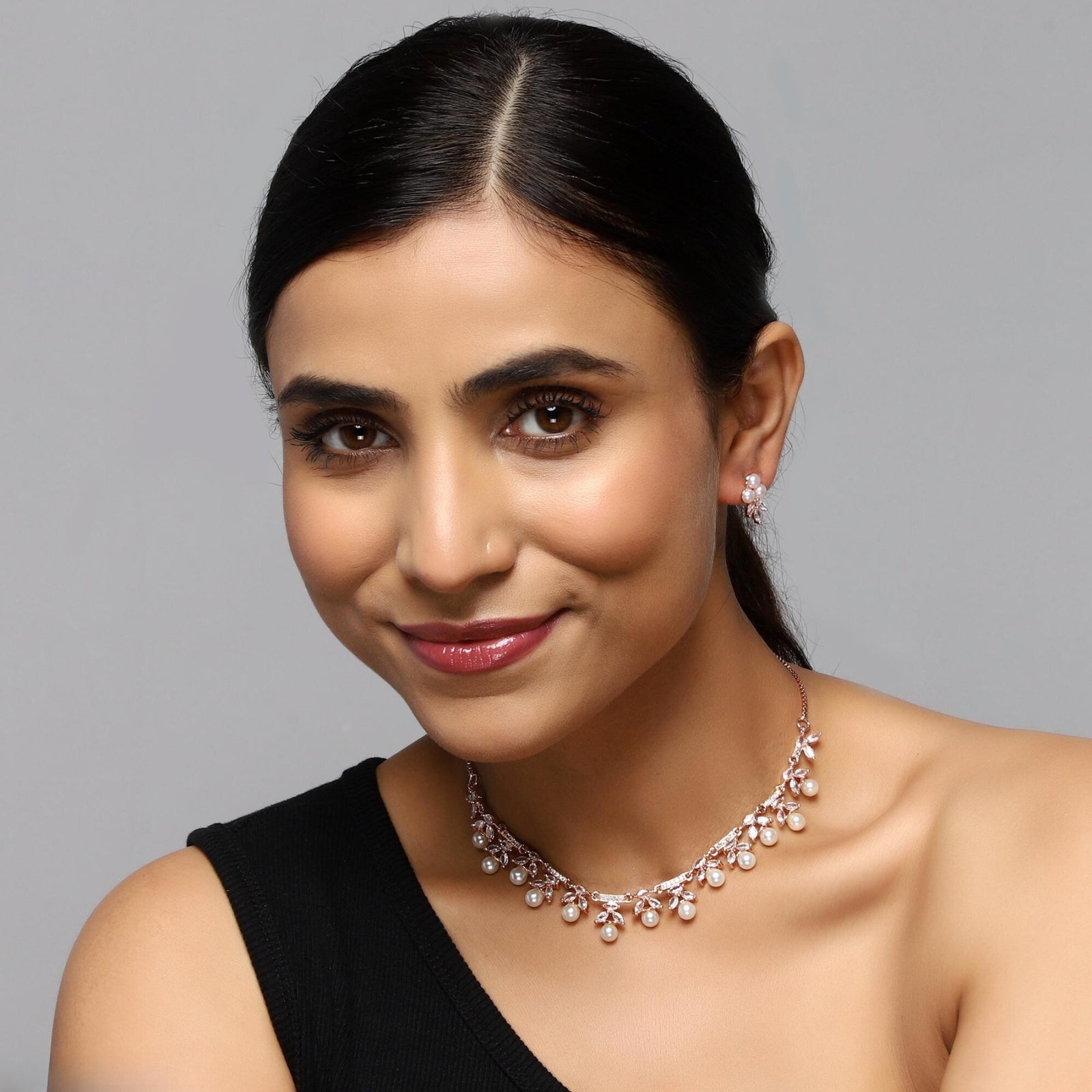 Jewellery set for women and girls featuring a rose gold-plated diamond necklace, earrings. Your outfit is complete, and you have a stunning appearance with this stunning diamond necklace. Wear it at big events to impress everyone with your appearance. This necklace set is the ideal fusion of conventional and modern style. Appropriate for All Forms of Dressy Events Any outfit gets a ravishing appearance boost from jewellery. A stunning ensemble would be incomplete without complementary jewellery. The Women's American Diamond Rose Gold-Plated Necklace Set will go well with any Indian outfit. Jewellery is a favourite among women since it not only enhances their appearance but also boosts their self-confidence. With this selection, make your occasion memorable. Unique, one-of-a-kind, classic embellishments with a glossy finish can be found on this jewellery set. Earrings are very simple to wear, light, and have a very pleasant style. Is perfect for a wedding. You will always look your finest in this earrings and necklace, which matches this wedding outfit well. One necklace and one pair of earrings are included.