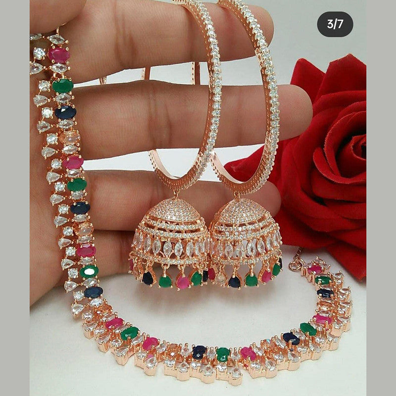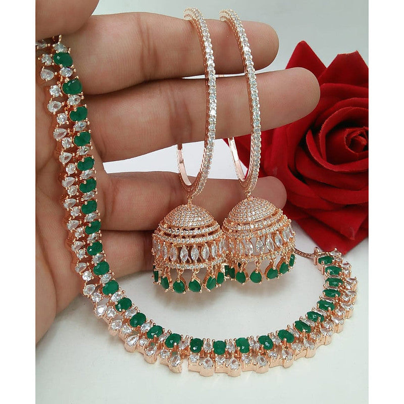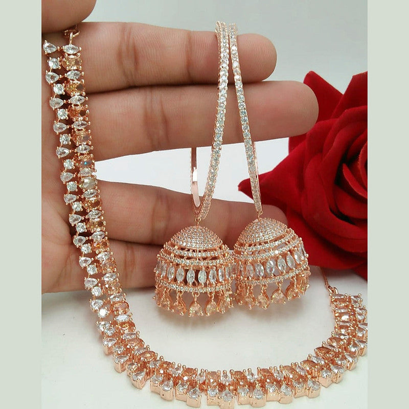 American Diamond Rose Gold Jewellery Set With Earrings with Maangtikka