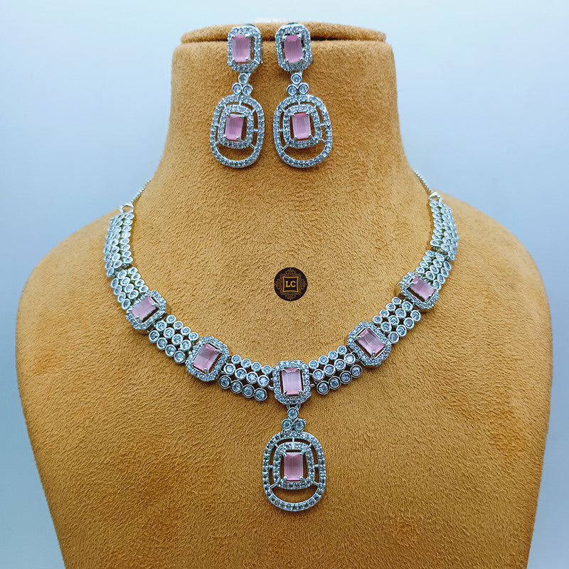 Jewellery set for women and girls featuring a silver-plated diamond necklace, earrings. Your outfit is complete, and you have a stunning appearance with this stunning diamond necklace. Wear it at big events to impress everyone with your appearance. This necklace set is the ideal fusion of conventional and modern style. Appropriate for All Forms of Dressy Events Any outfit gets a ravishing appearance boost from jewellery. A stunning ensemble would be incomplete without complementary jewellery. The Women's American Diamond Silver Plated Necklace Set will go well with any Indian outfit. Jewellery is a favourite among women since it not only enhances their appearance but also boosts their self-confidence. With this selection, make your occasion memorable. Unique, one-of-a-kind, classic embellishments with a glossy finish can be found on this jewellery set. Earrings are very simple to wear, light, and have a very pleasant style. Is perfect for a wedding. You will always look your finest in this earrings and necklace, which matches this wedding outfit well. One necklace and one pair of earrings are included.