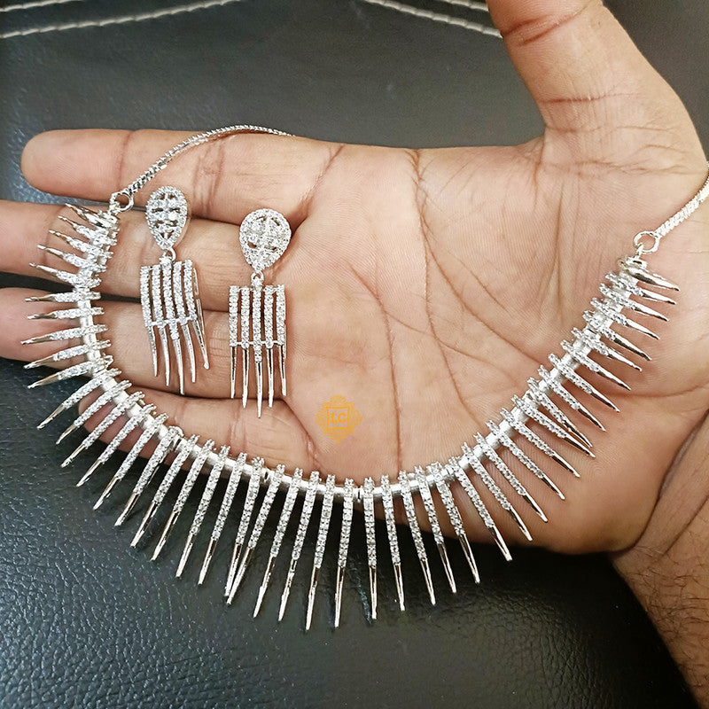 Jewellery set for women and girls featuring a silver-plated diamond necklace, earrings. Your outfit is complete, and you have a stunning appearance with this stunning diamond necklace. Wear it at big events to impress everyone with your appearance. This necklace set is the ideal fusion of conventional and modern style. Appropriate for All Forms of Dressy Events Any outfit gets a ravishing appearance boost from jewellery. A stunning ensemble would be incomplete without complementary jewellery. The Women's American Diamond Silver Plated Necklace Set will go well with any Indian outfit. Jewellery is a favourite among women since it not only enhances their appearance but also boosts their self-confidence. With this selection, make your occasion memorable. Unique, one-of-a-kind, classic embellishments with a glossy finish can be found on this jewellery set. Earrings are very simple to wear, light, and have a very pleasant style. Is perfect for a wedding. You will always look your finest in this earrings and necklace, which matches this wedding outfit well. One necklace and one pair of earrings are included.