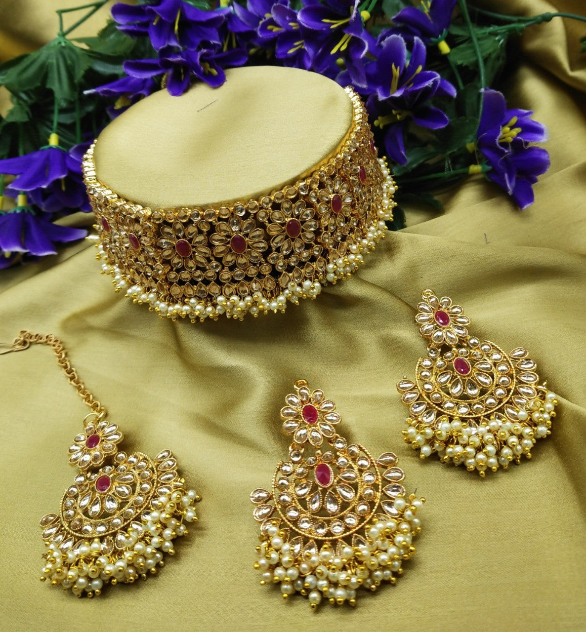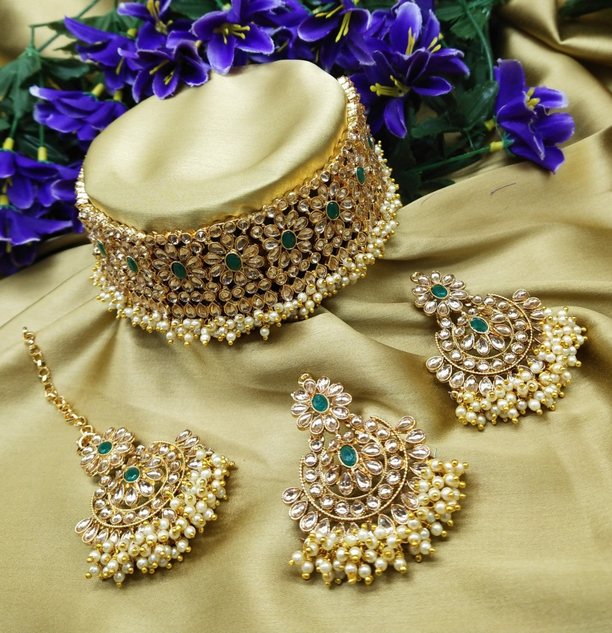 Heavily embellished with stones and faux kundan gems, this choker necklace set has been fashioned out of brass. Yellow gold plated and a good match for formal ethnic looks. This piece of jewelry comes with the LC assurance of quality and durability.