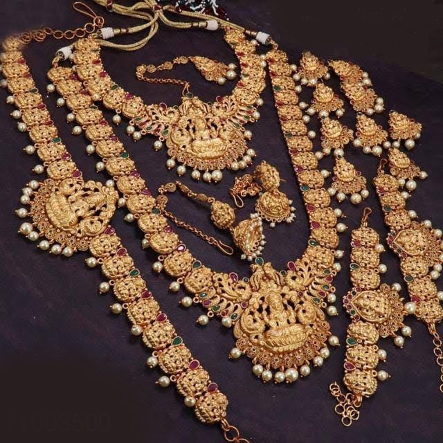 Brass bridal set in a traditional temple design. Inclusive of all essential accessories and yellow gold plated. Wear with ethnic bridal outfits.