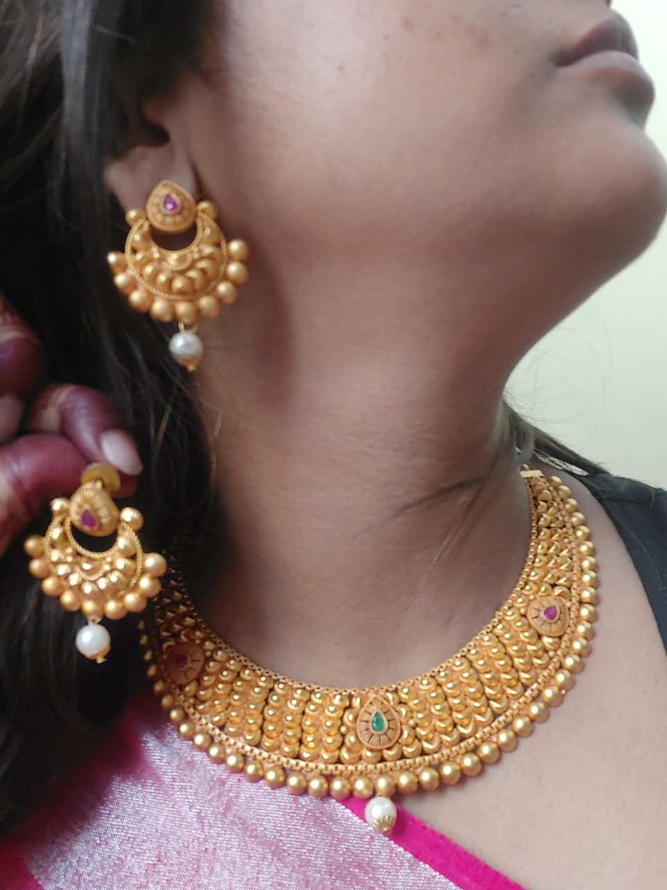 Copper necklace set with goddess Lakshmi motifs. Copper plated and lightly embellished. Good for formal wear. This piece of jewelry comes with the LC assurance of quality and durability.